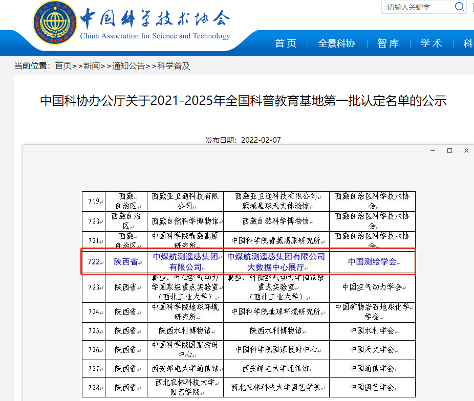 近日,中国科学技术协会公布了《2021-2025年全国科普教育基地第一批认定名单》,中煤航测遥感集团大数据中心展厅经中国测绘学会筛选推荐、中国科学技术协会审核,被认定为“全国科普教育基地”。此次评审中,全国测绘系统共有5家单位通过认定,集团是中西部地区唯一一家单位。